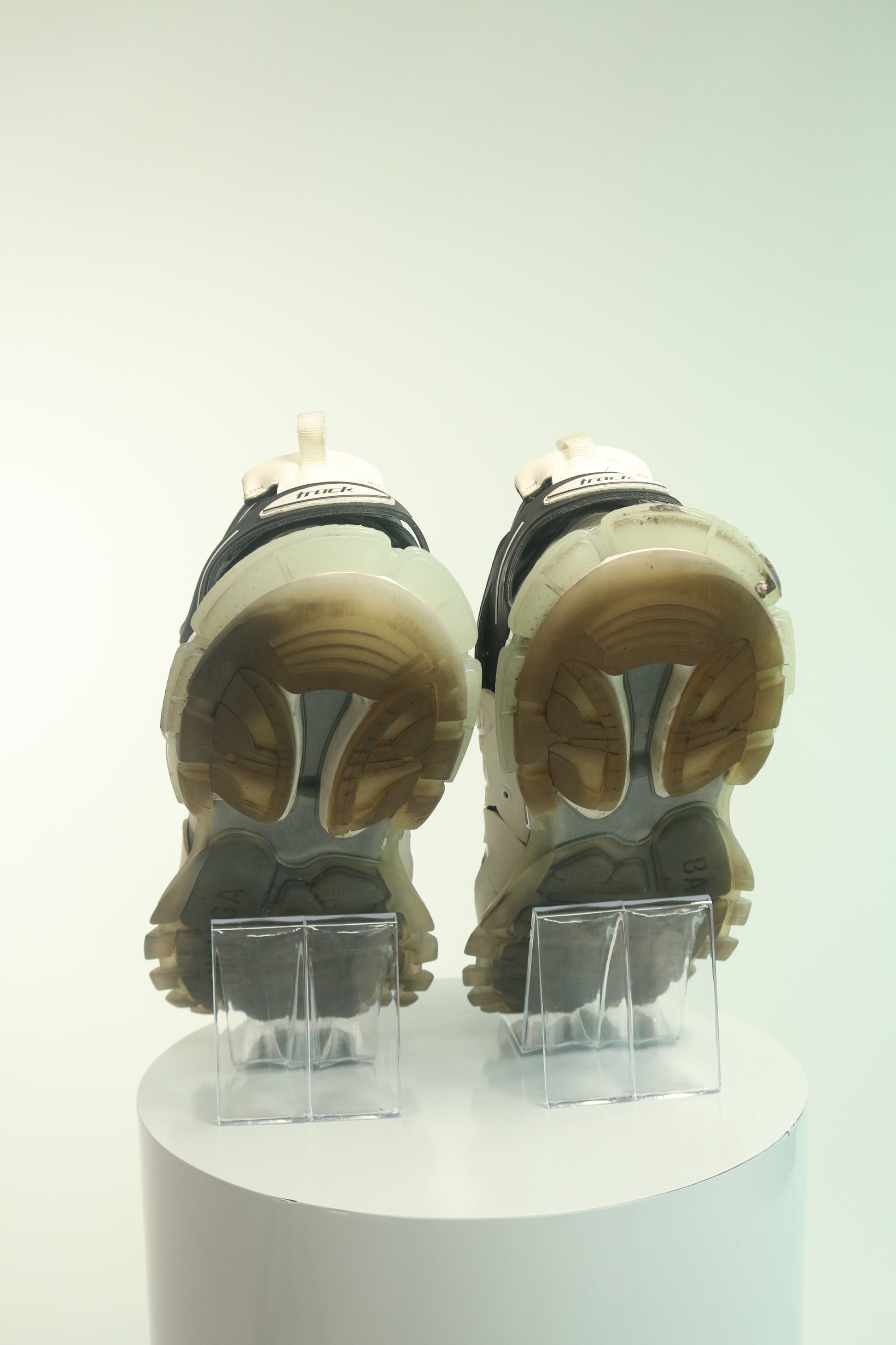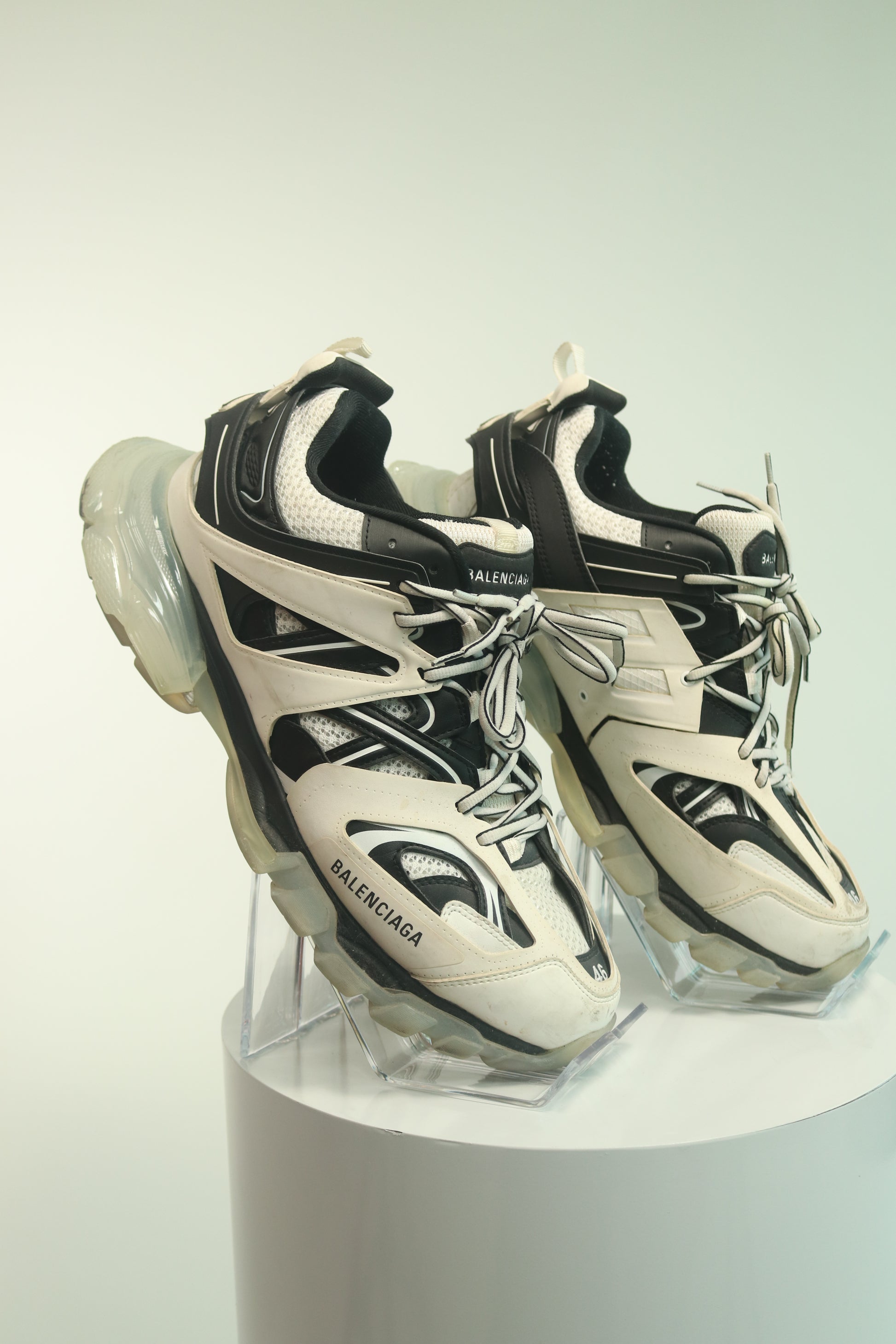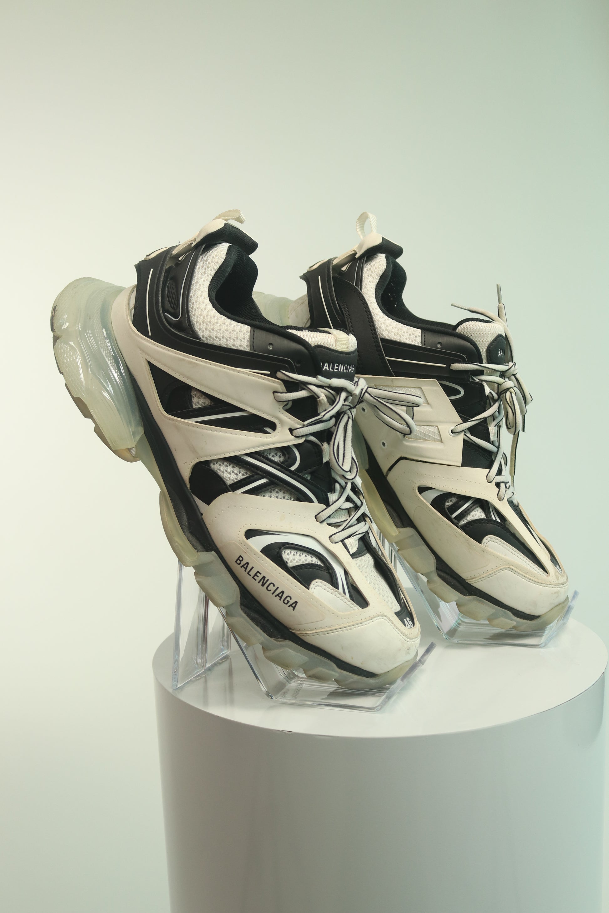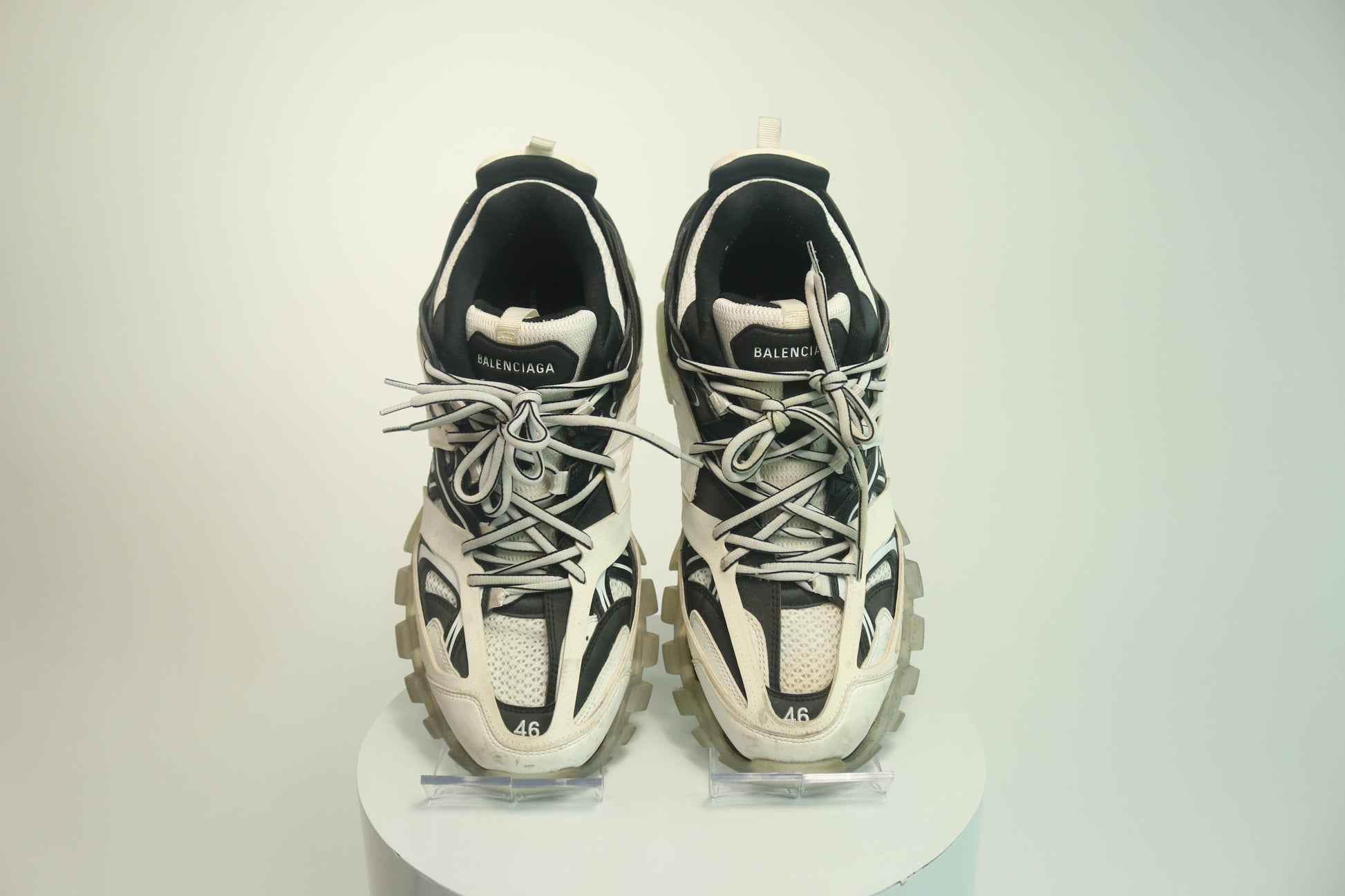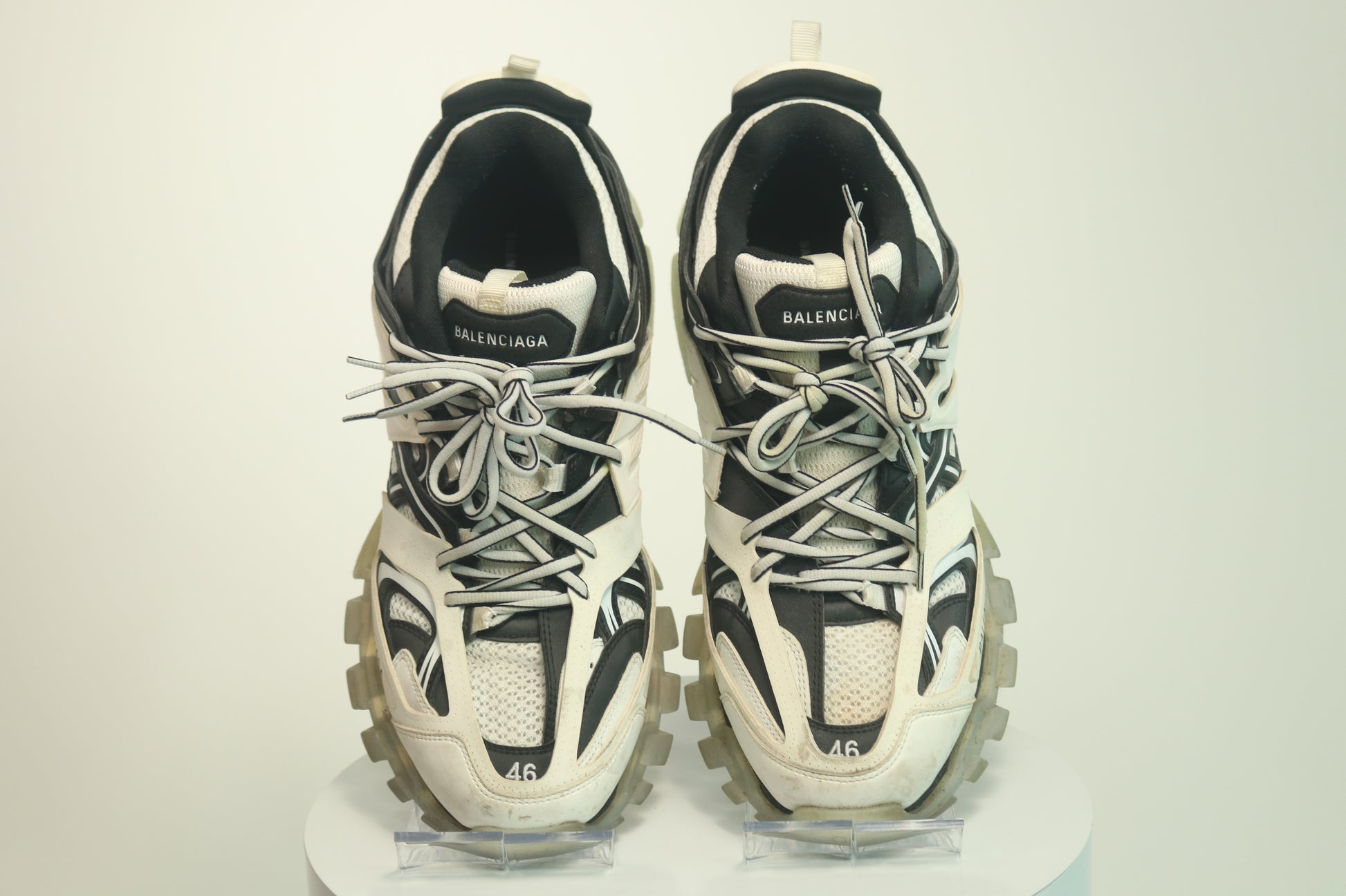 Improve your athletic performance with the Balenciaga Track Sneakers. These sleek black and white sneakers provide a comfortable fit and are in good condition, perfect for standard wear. Elevate your style while staying on top of your game.