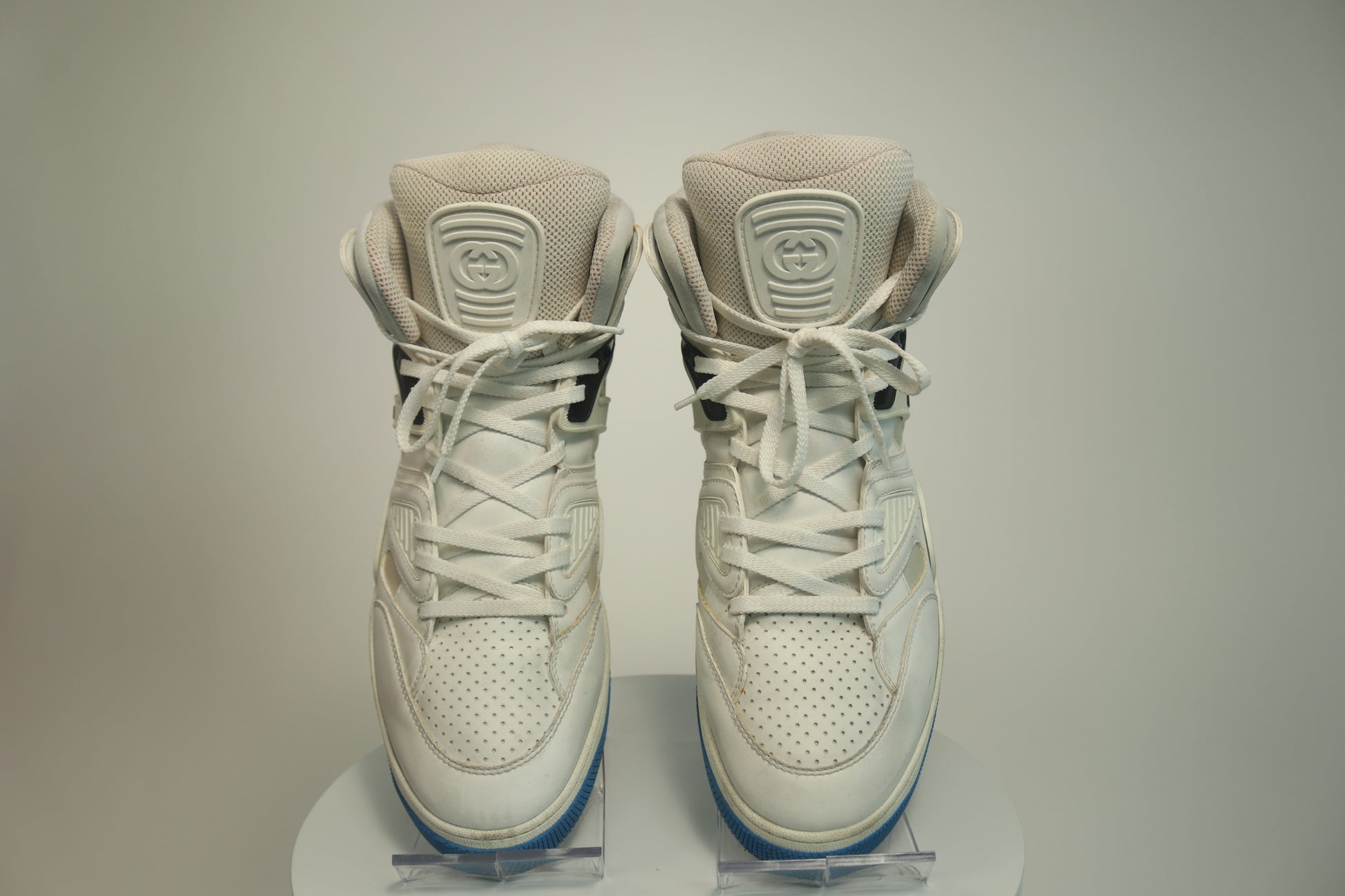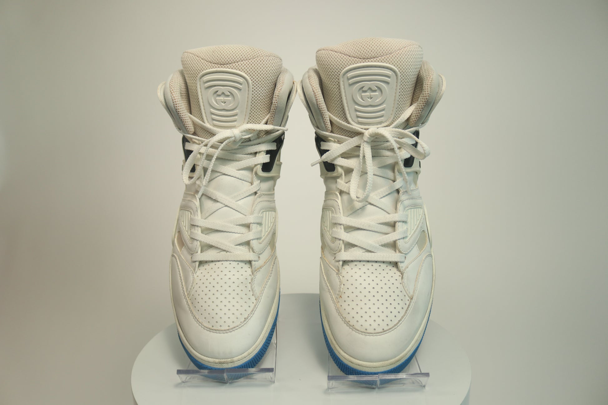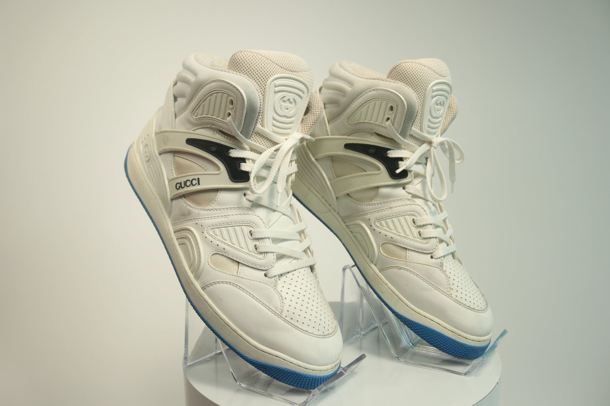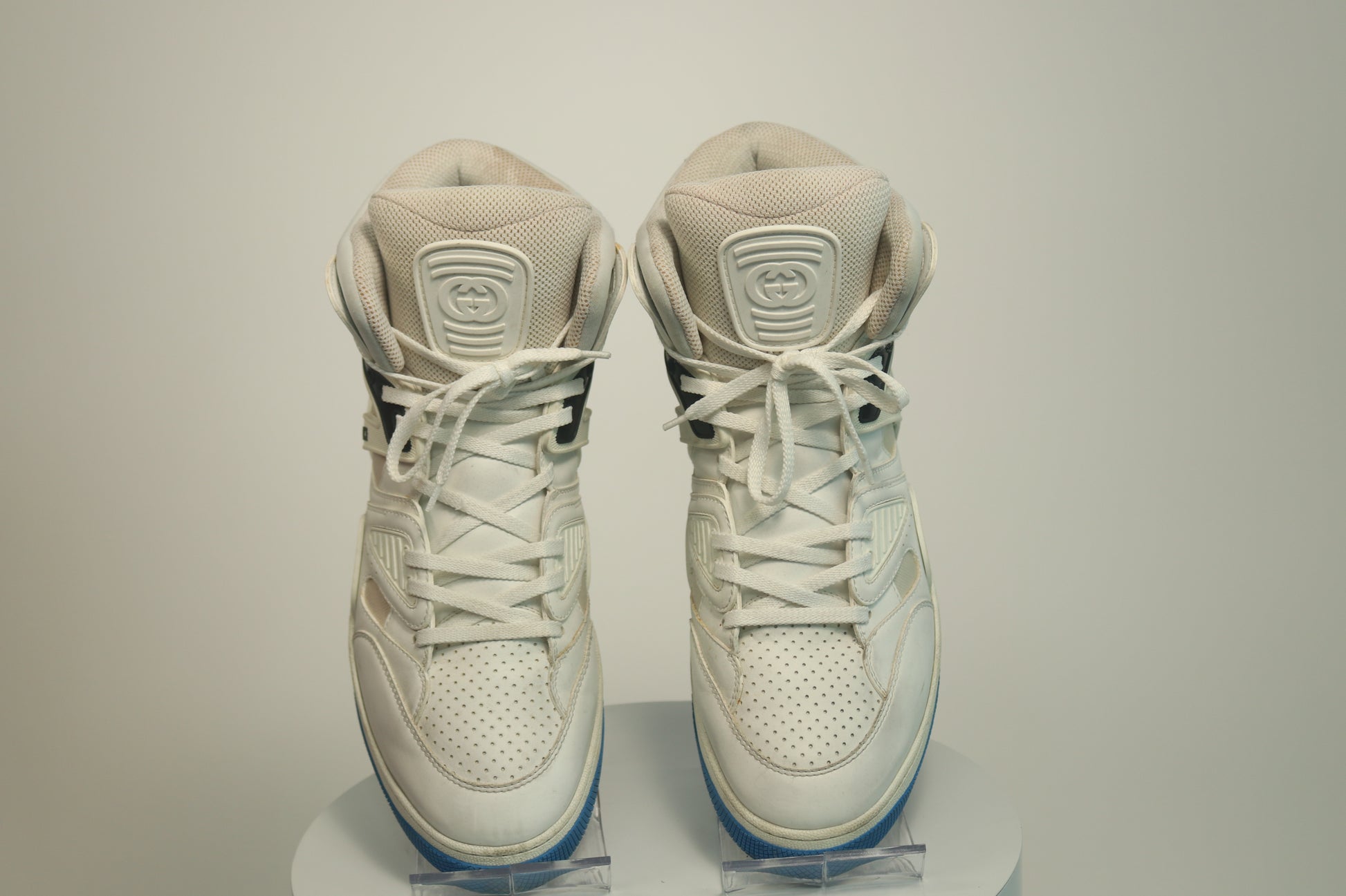 Expertly crafted in Italy, these Gucci Basket Blue High Top Sneakers are the perfect addition to any fashion-forward man's wardrobe. With a sleek white design and good condition, they offer both style and durability. Experience the standard of worn wear with these must-have sneakers.