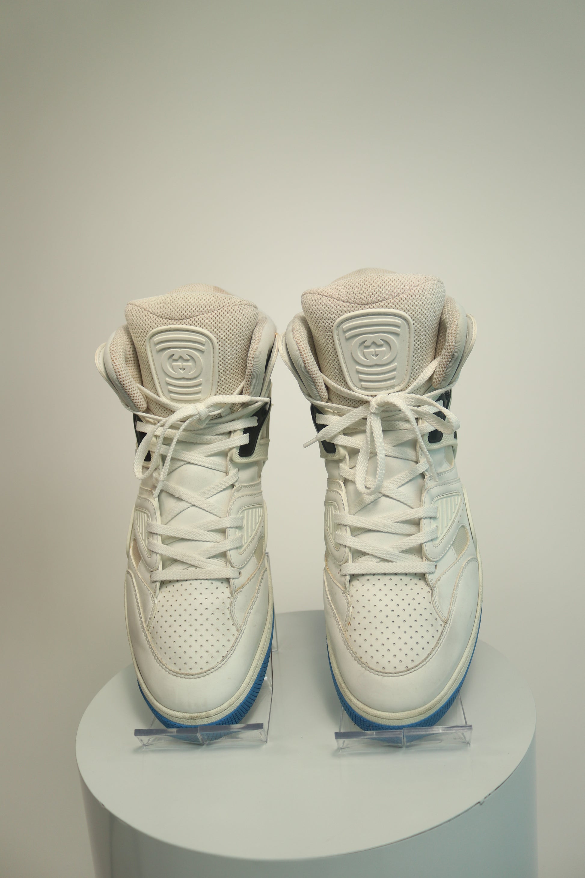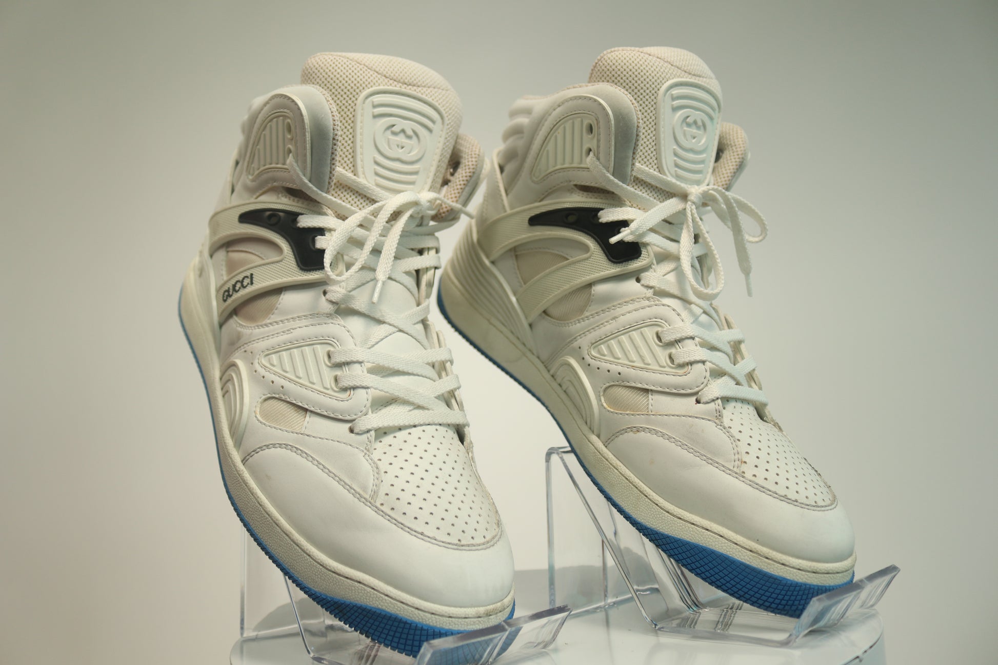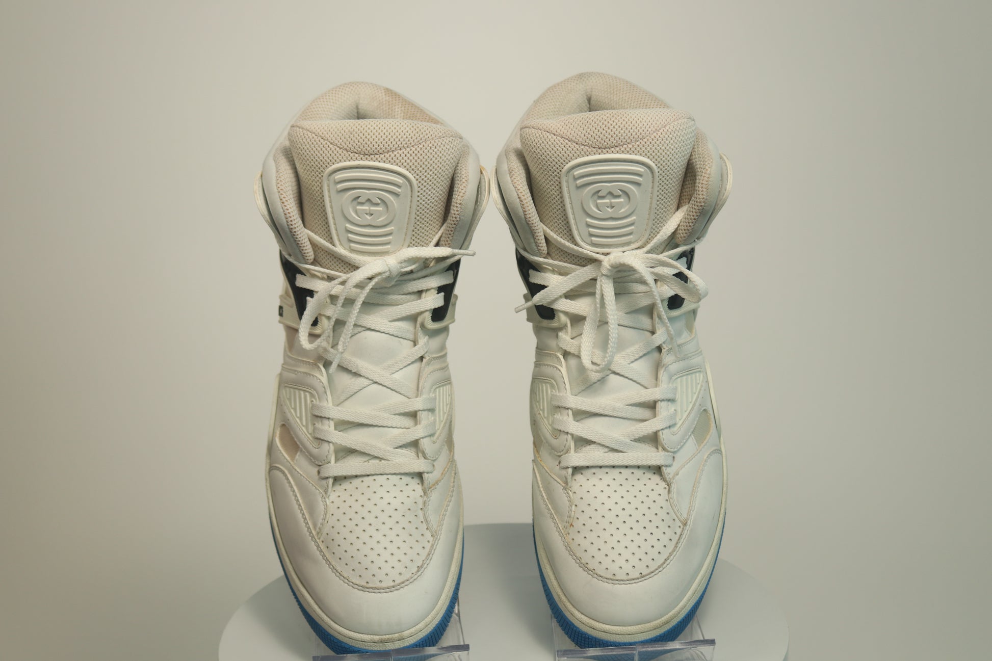 Expertly crafted in Italy, these Gucci Basket Blue High Top Sneakers are the perfect addition to any fashion-forward man's wardrobe. With a sleek white design and good condition, they offer both style and durability. Experience the standard of worn wear with these must-have sneakers.
