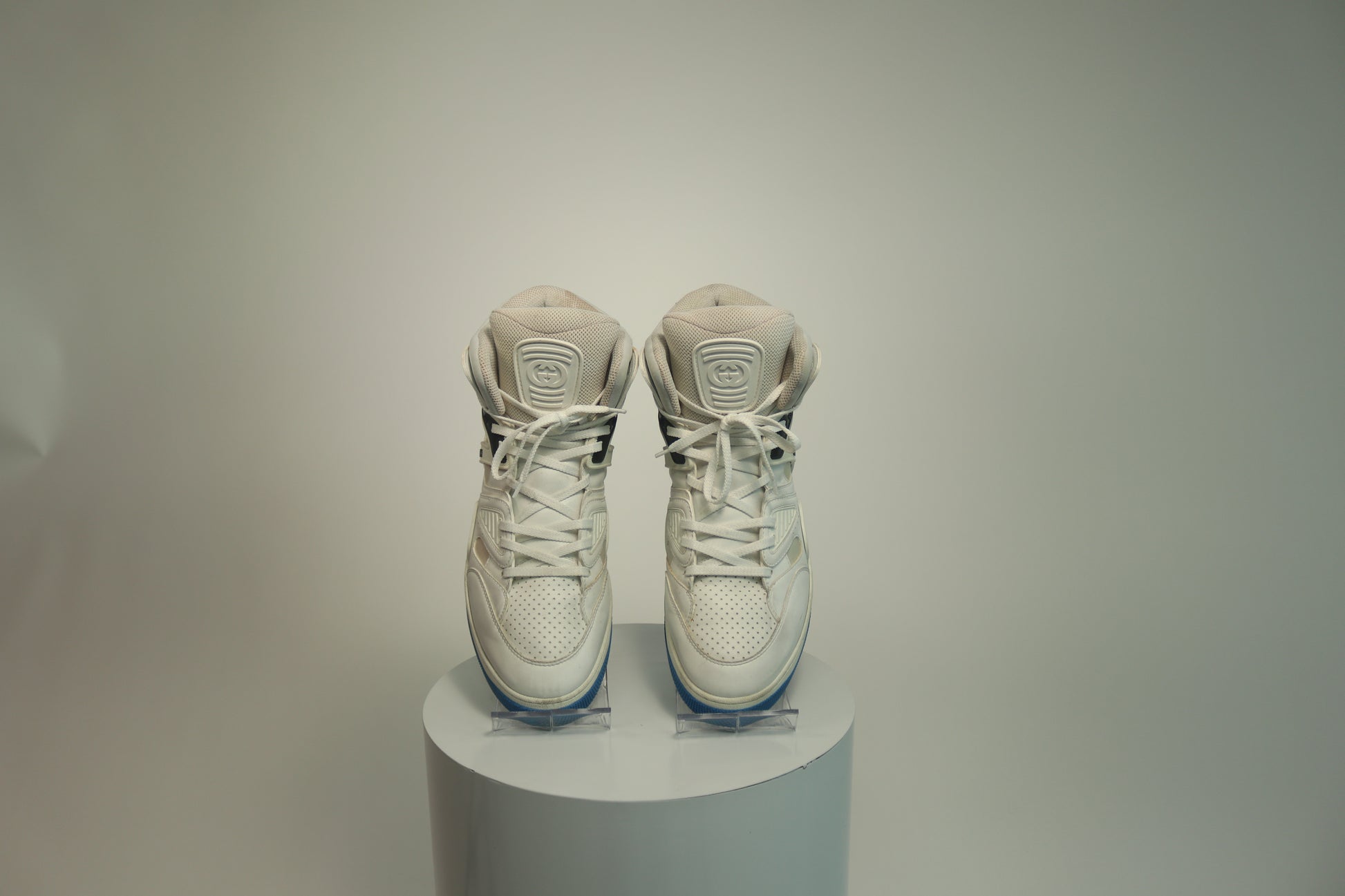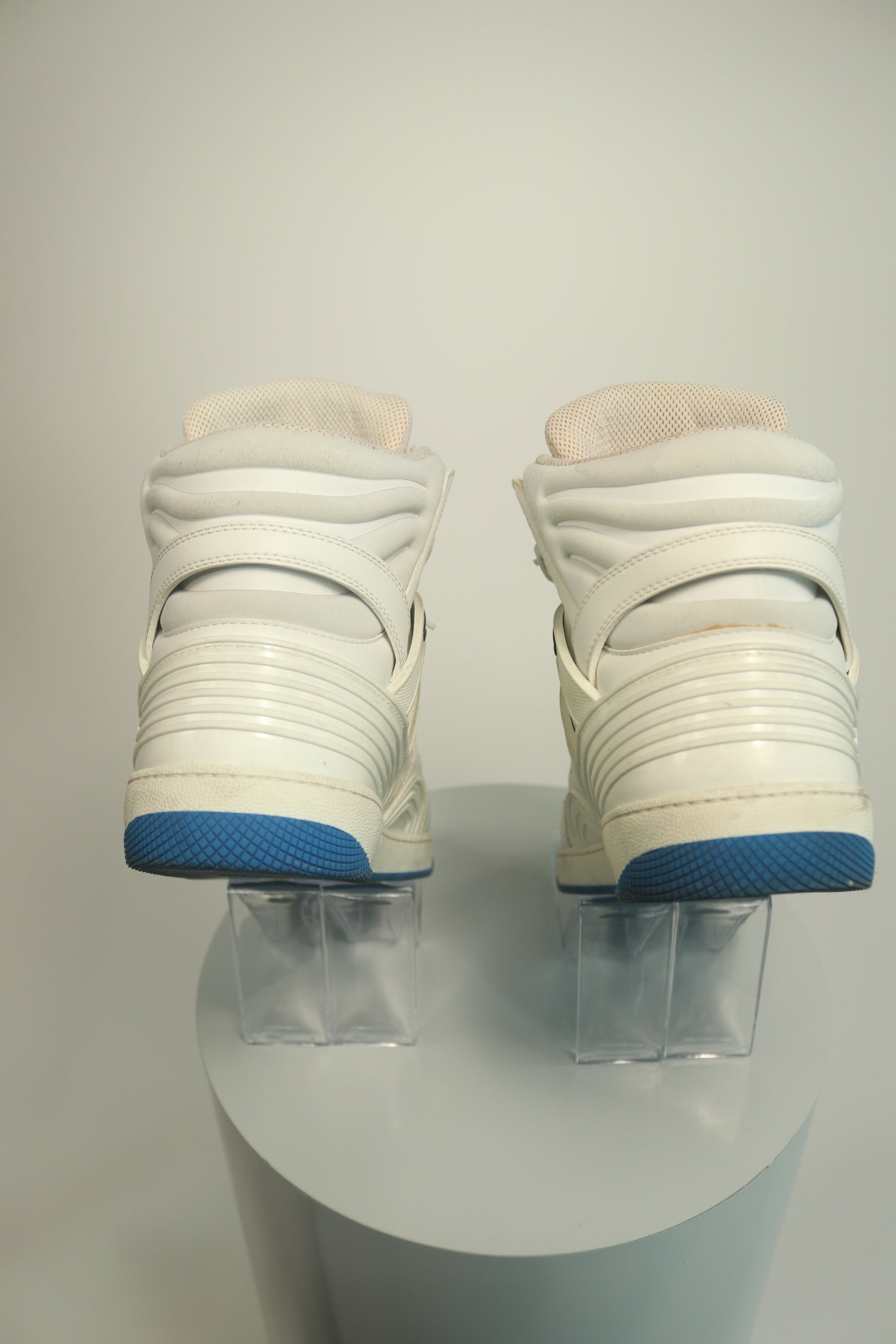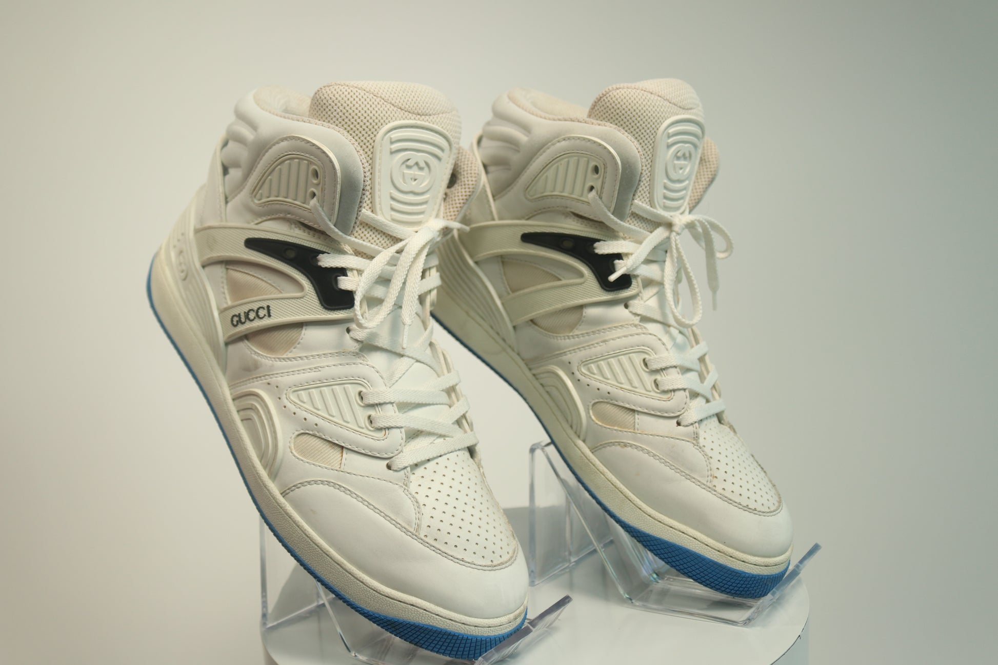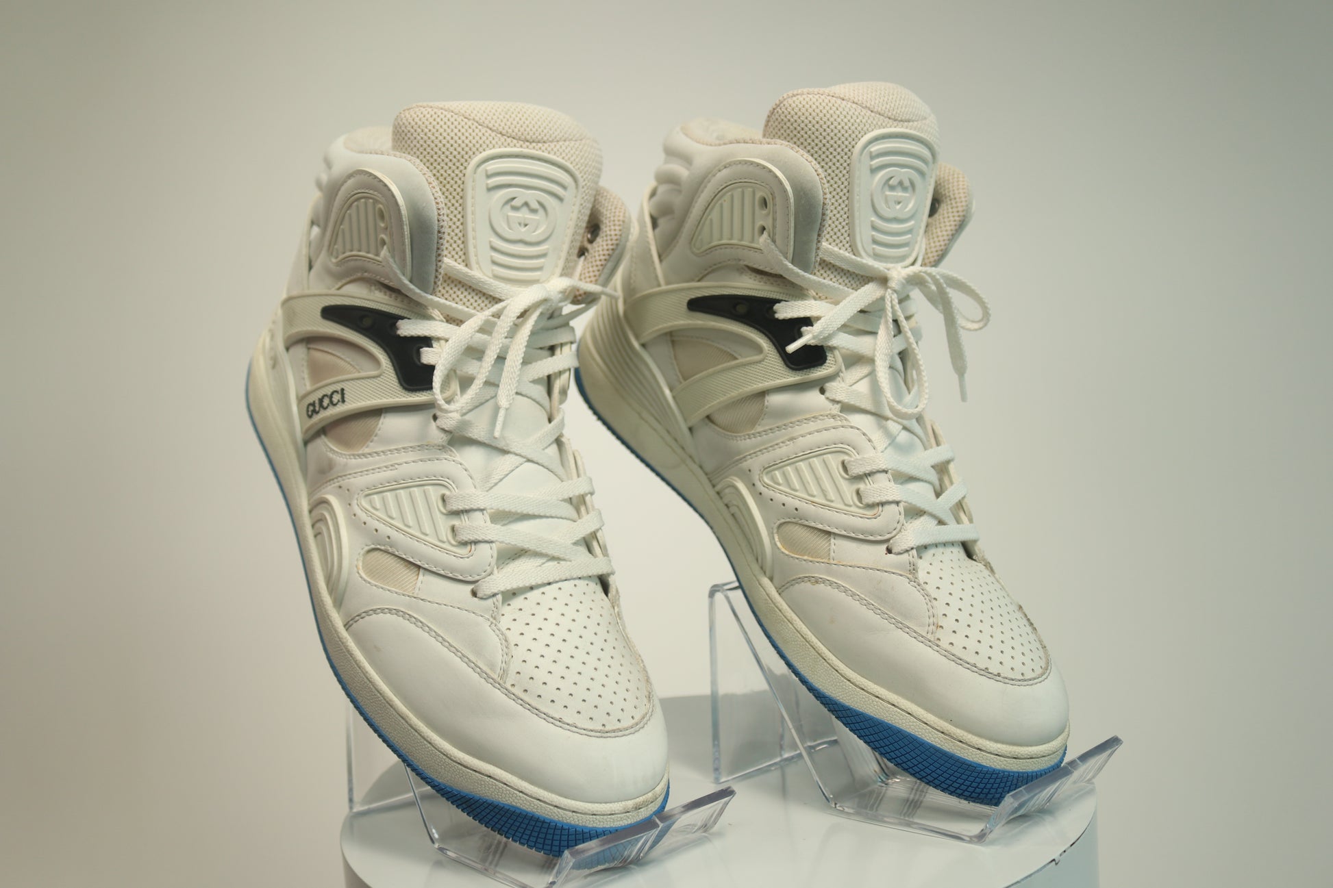 Expertly crafted in Italy, these Gucci Basket Blue High Top Sneakers are the perfect addition to any fashion-forward man's wardrobe. With a sleek white design and good condition, they offer both style and durability. Experience the standard of worn wear with these must-have sneakers.