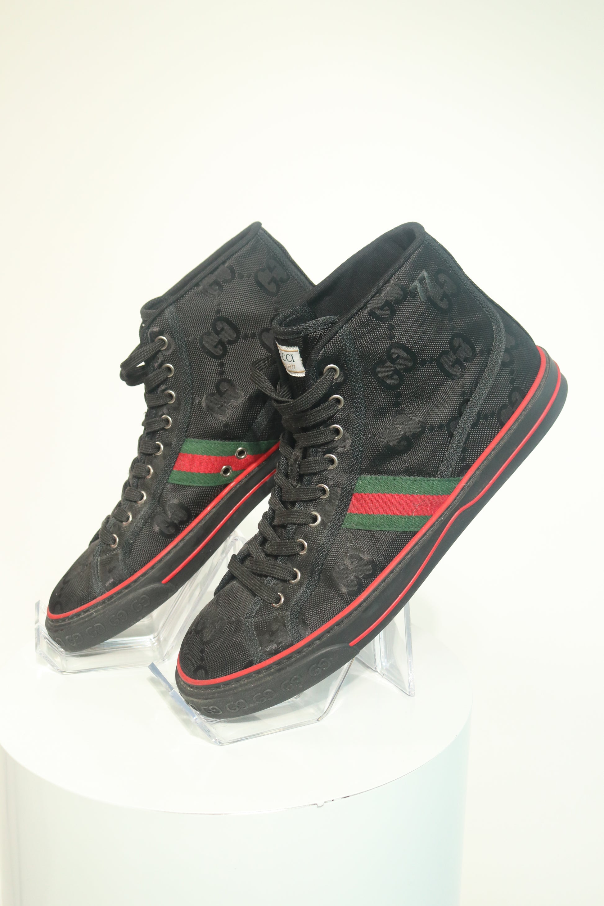 These Gucci Tennis 1977 High Top Sneakers are a must-have for the fashion-conscious man. Made in Italy, they feature the iconic Gucci colors in a sleek black design. The sneakers, in size 46, offer both style and comfort for everyday wear.