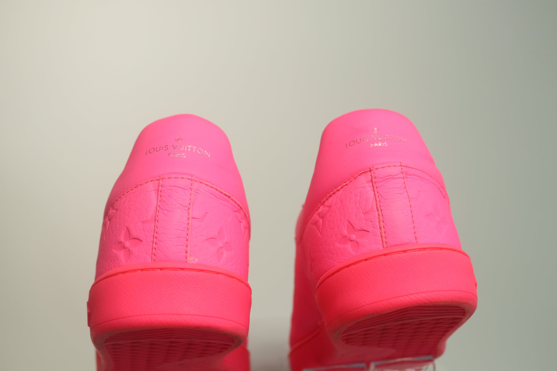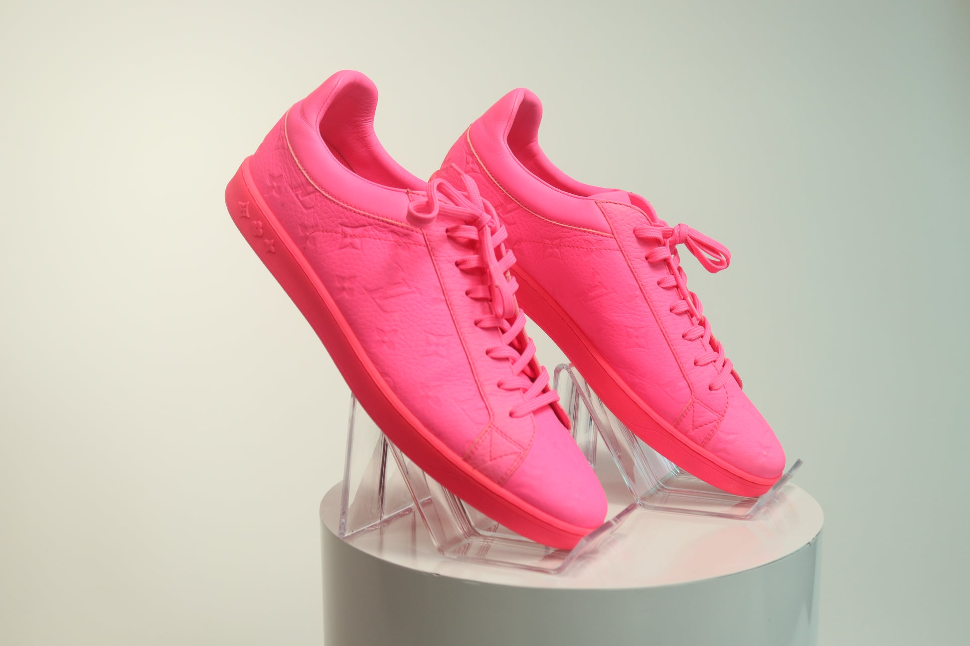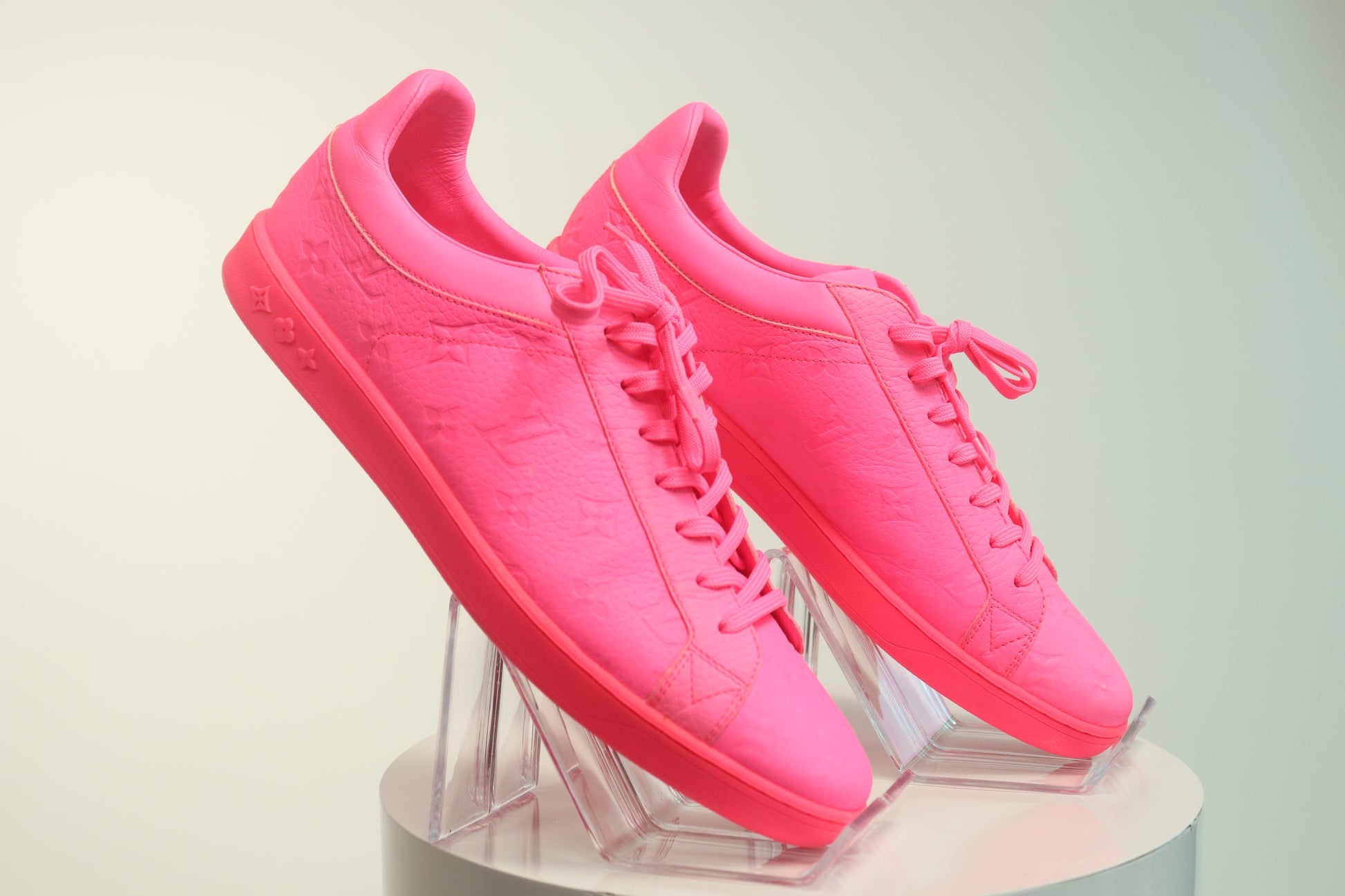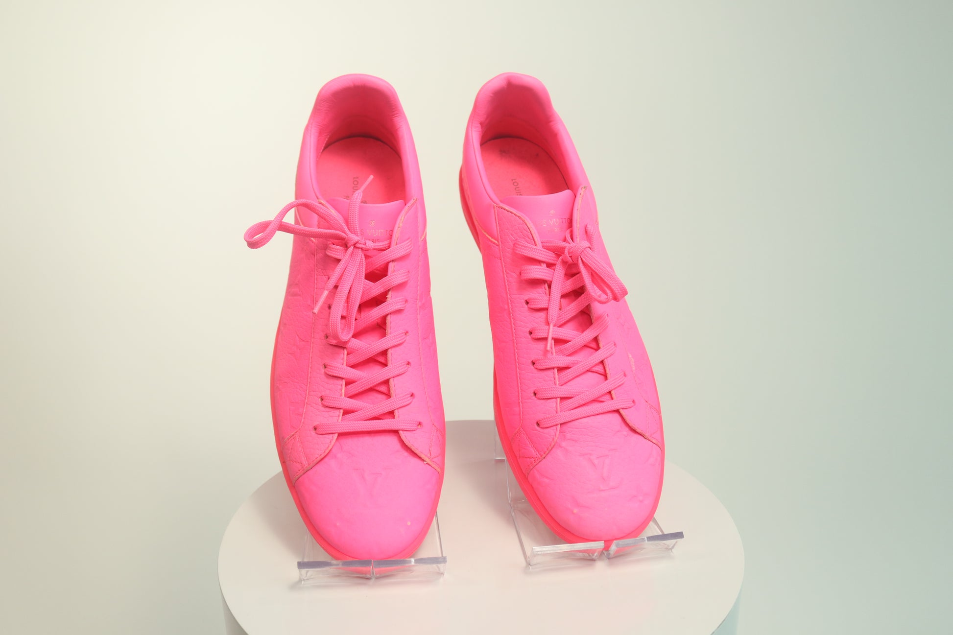 Expertly crafted in Italy, these Louis Vuitton Luxembourg Leather Sneakers are designed for the modern man. In a vibrant hot pink color, these sneakers offer a pop of color to any outfit. Made with high-quality leather, they are in good condition with standard wear, providing both style and durability.