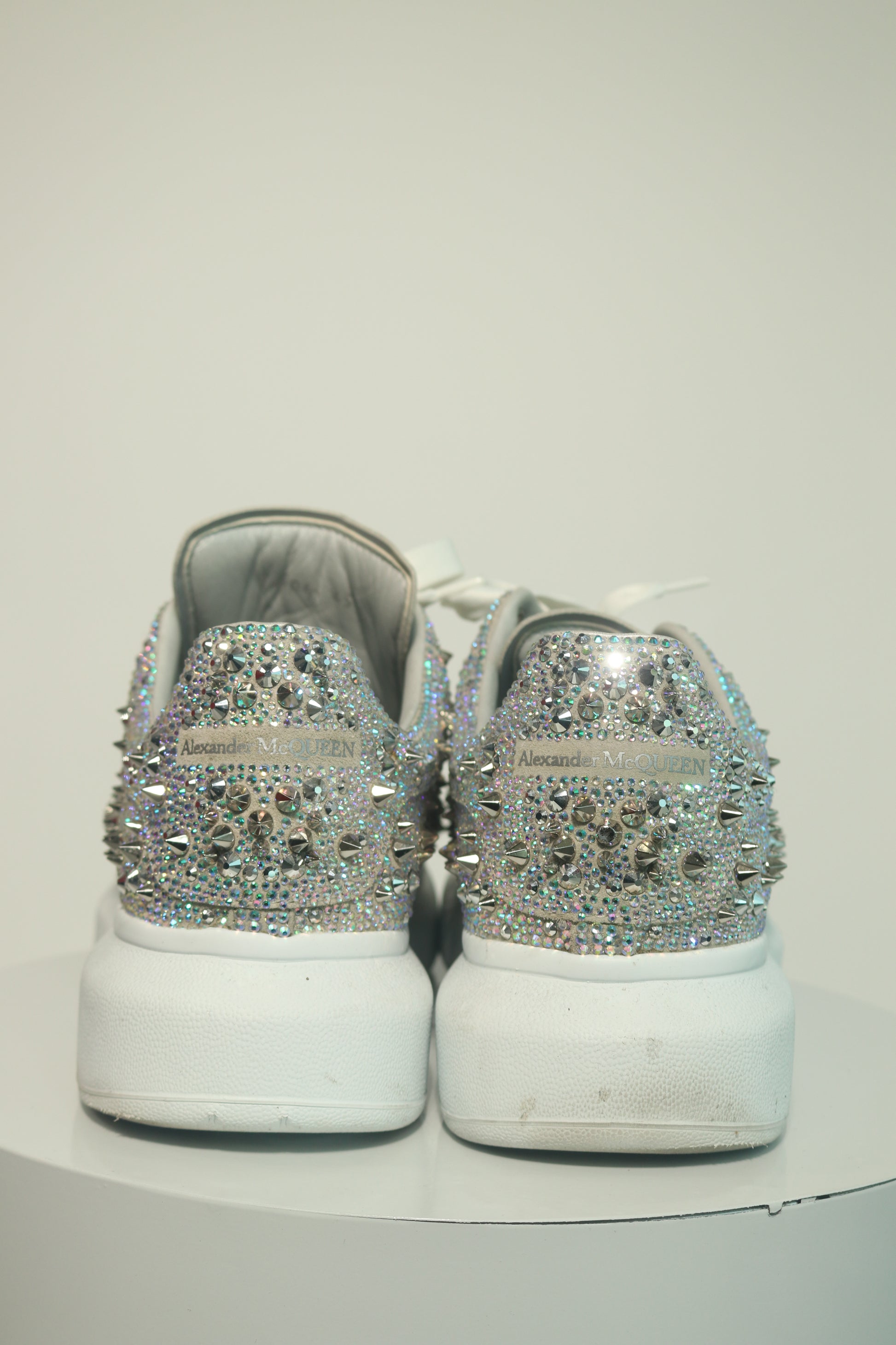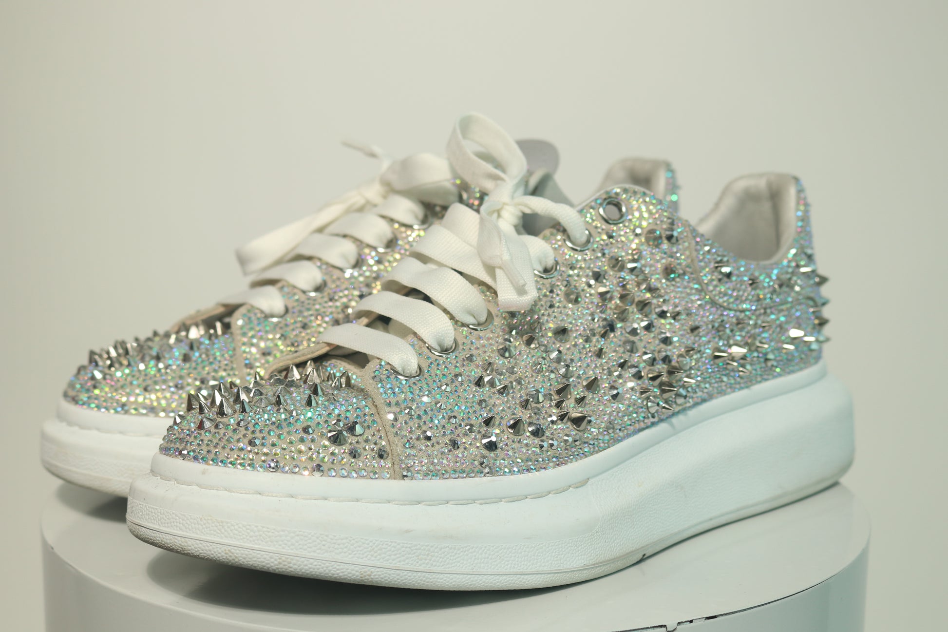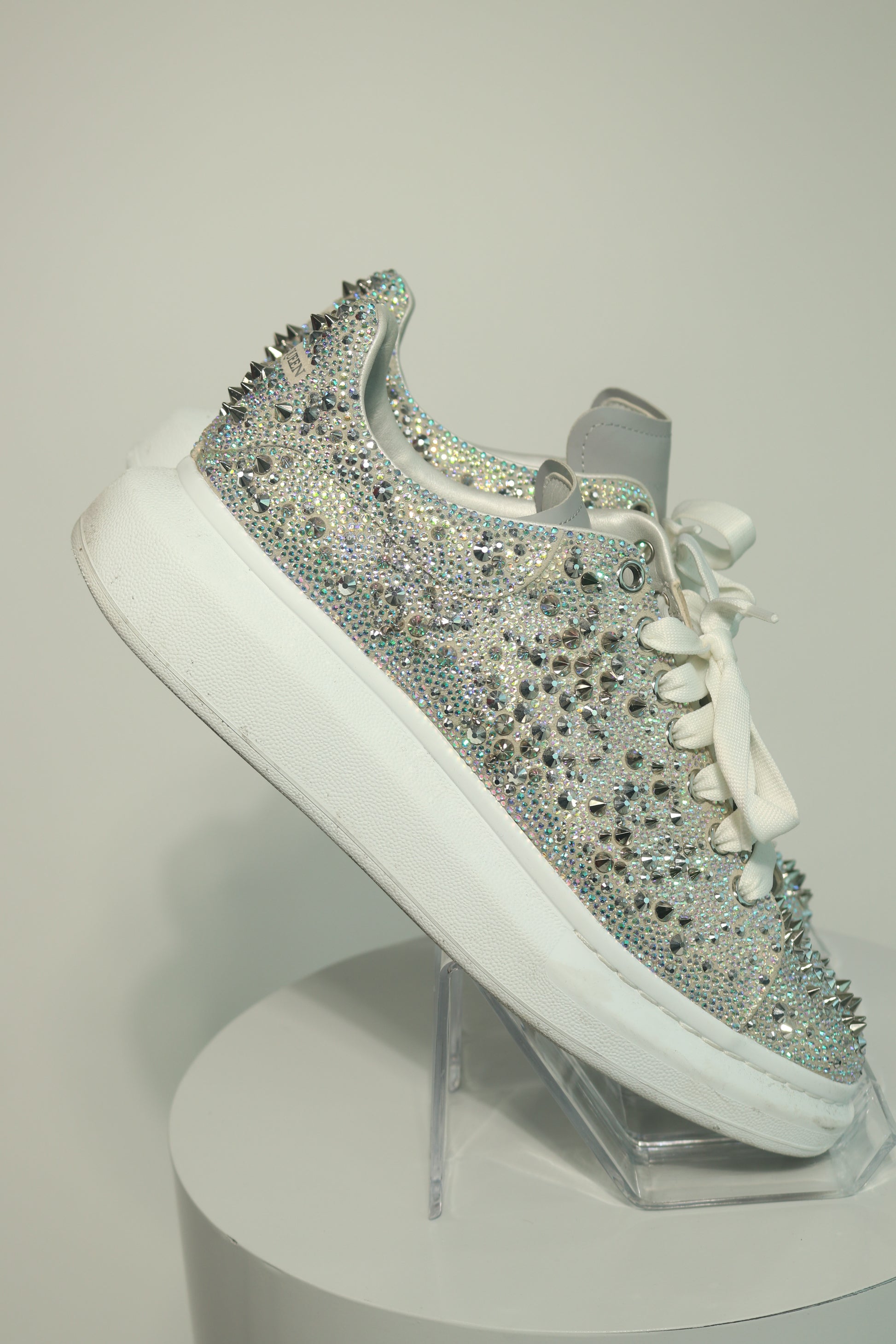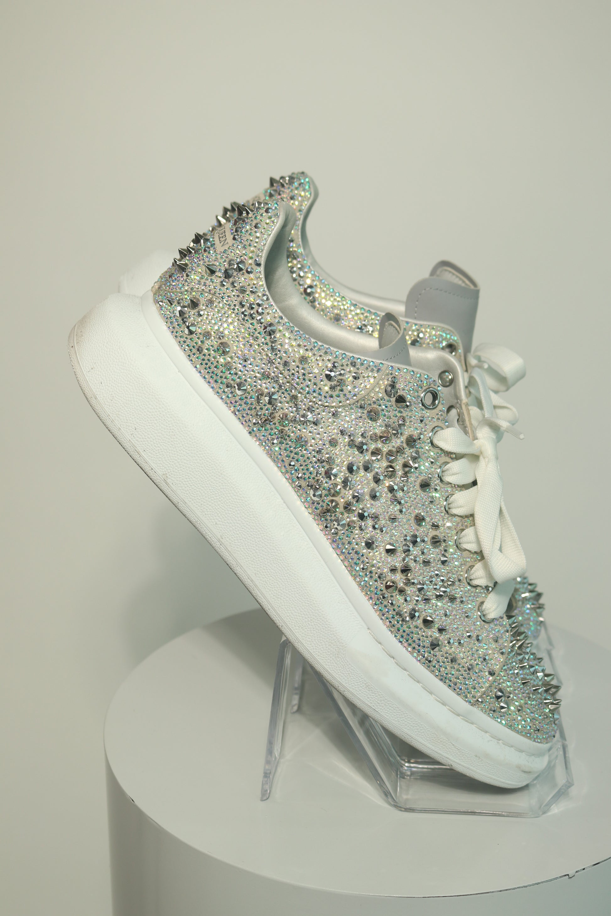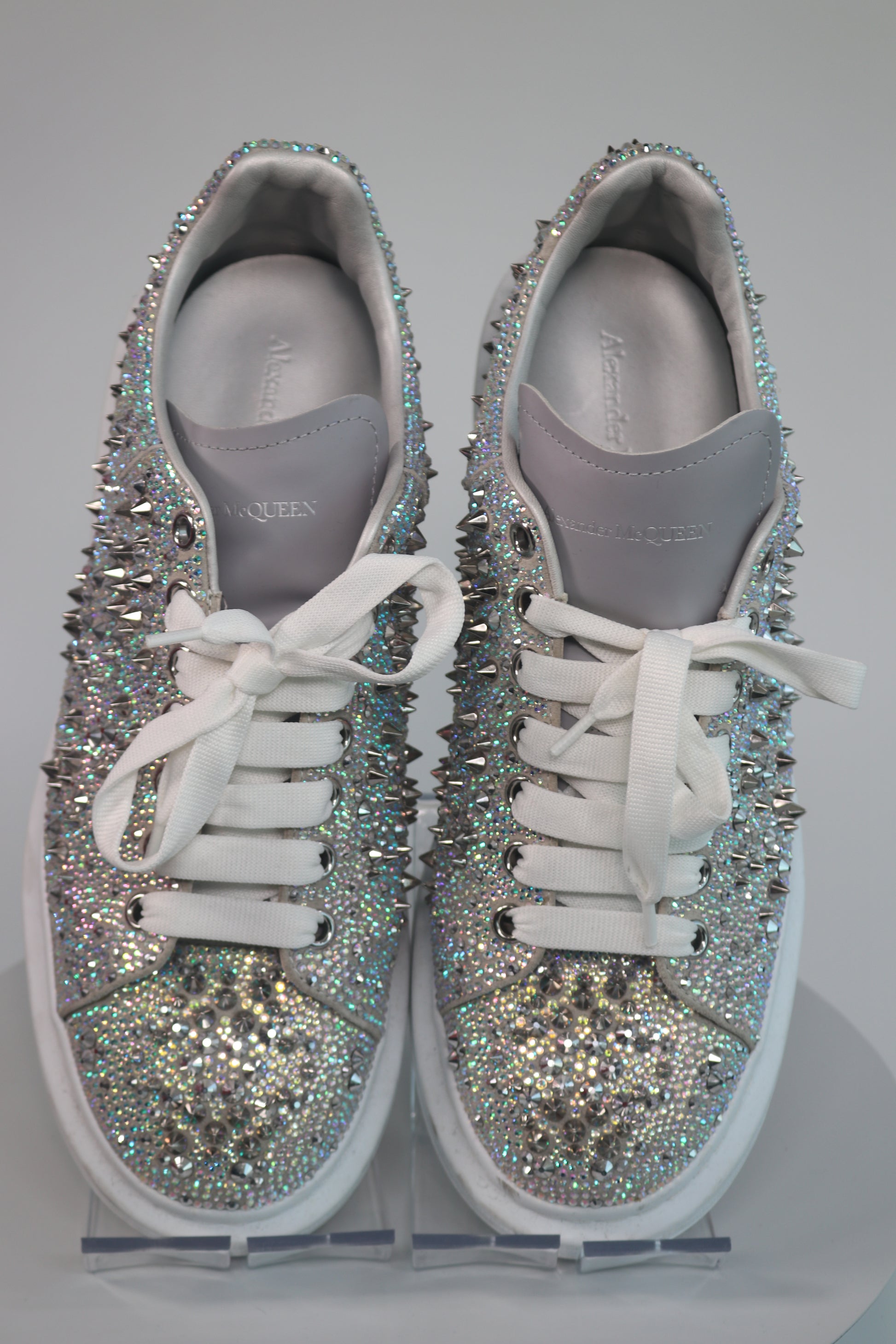 These McQueen Crystal Low Top Sneakers are expertly crafted in Italy and sized for men (46). The sleek white design adds a touch of style to any outfit while the durable material ensures great condition, even with some scuffs. Elevate your footwear game with these high-quality sneakers.